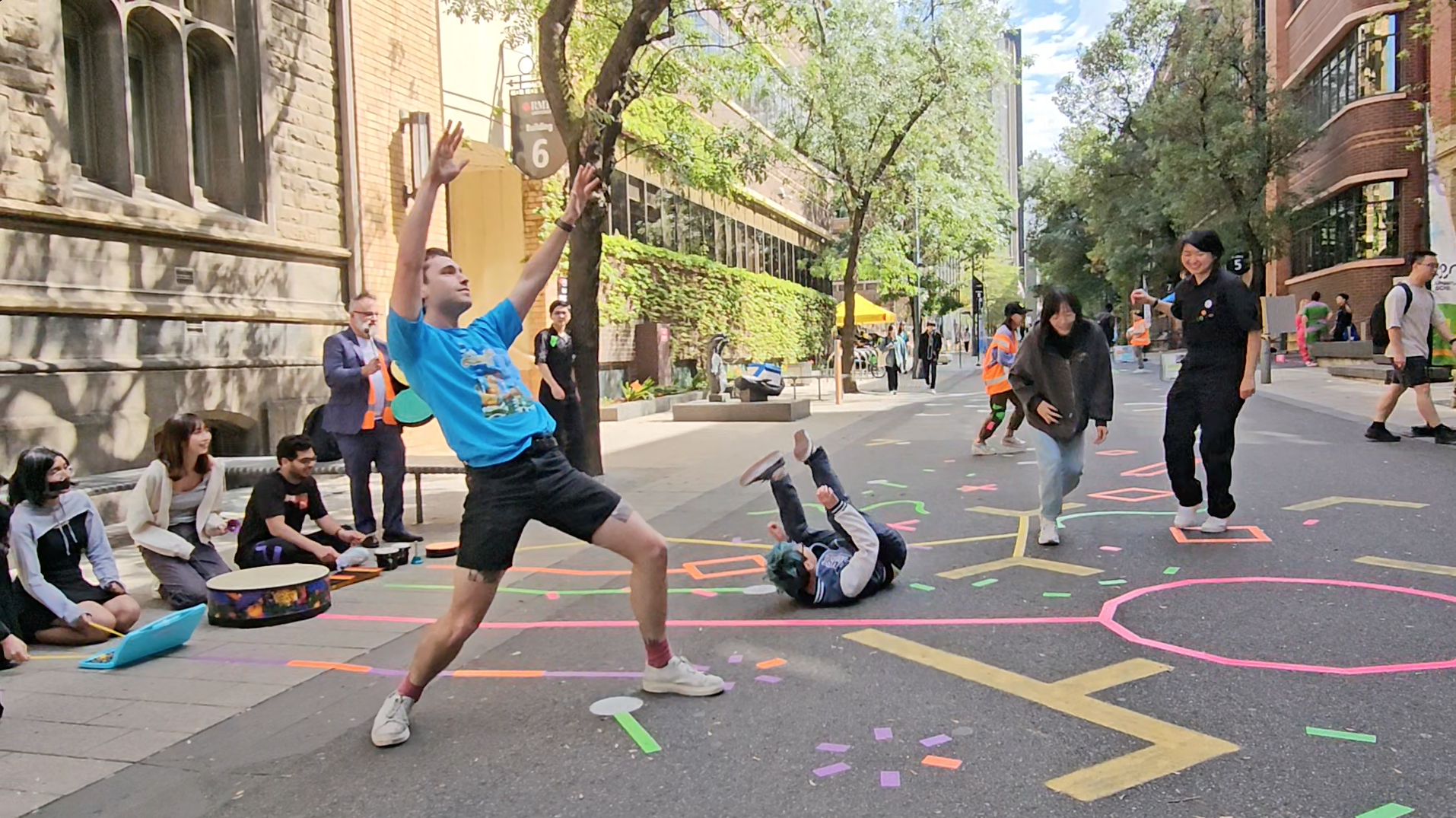 Initially developed with Dr Troy Innocent at the Future Play Lab (RMIT) for a series of activations connected to an open-access and community-driven public parklet, YomeciBand invites passersby to walk and play with musical chalk creatures drawn on the footpath. Resembling a hopscotch game or obstacle course, the design, shape and position of these drawings suggest physical actions to the player; hopping, leaping, twisting, running etc. As players interact with the drawings, audio compositions and tunes are activated and everchanging, ‘following’ people’s traversal and movement. The technology of YomeciBand is deliberately unobtrusive and embedded in the surrounding urban infrastructure, inviting people into a serendipitous ‘otherworldly’ experience within a city street.